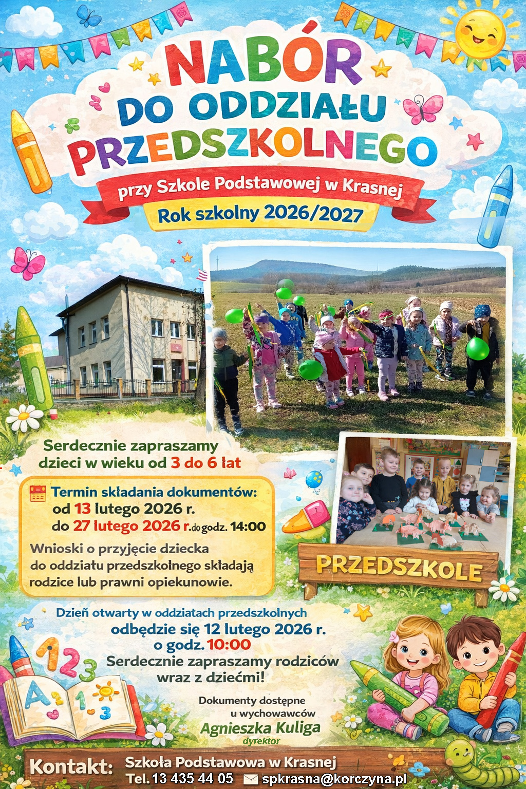 Rozpoczęcie rekrutacji dzieci w wieku od 3 do 6 lat do oddziału przedszkolnego przy Szkole Podstawowej w Krasnej na rok szkolny 2026/2027. Dodano 6 lutego 2026